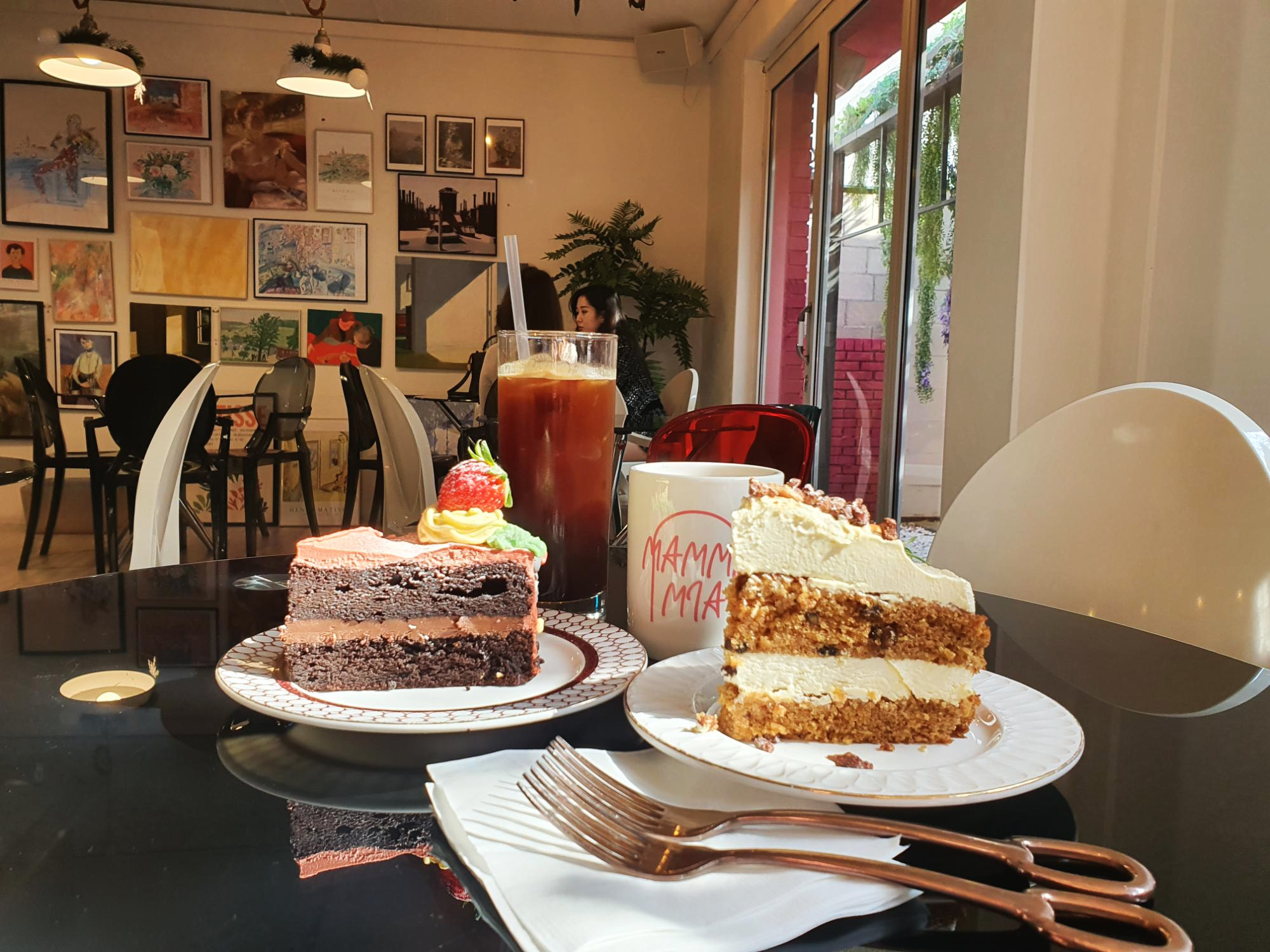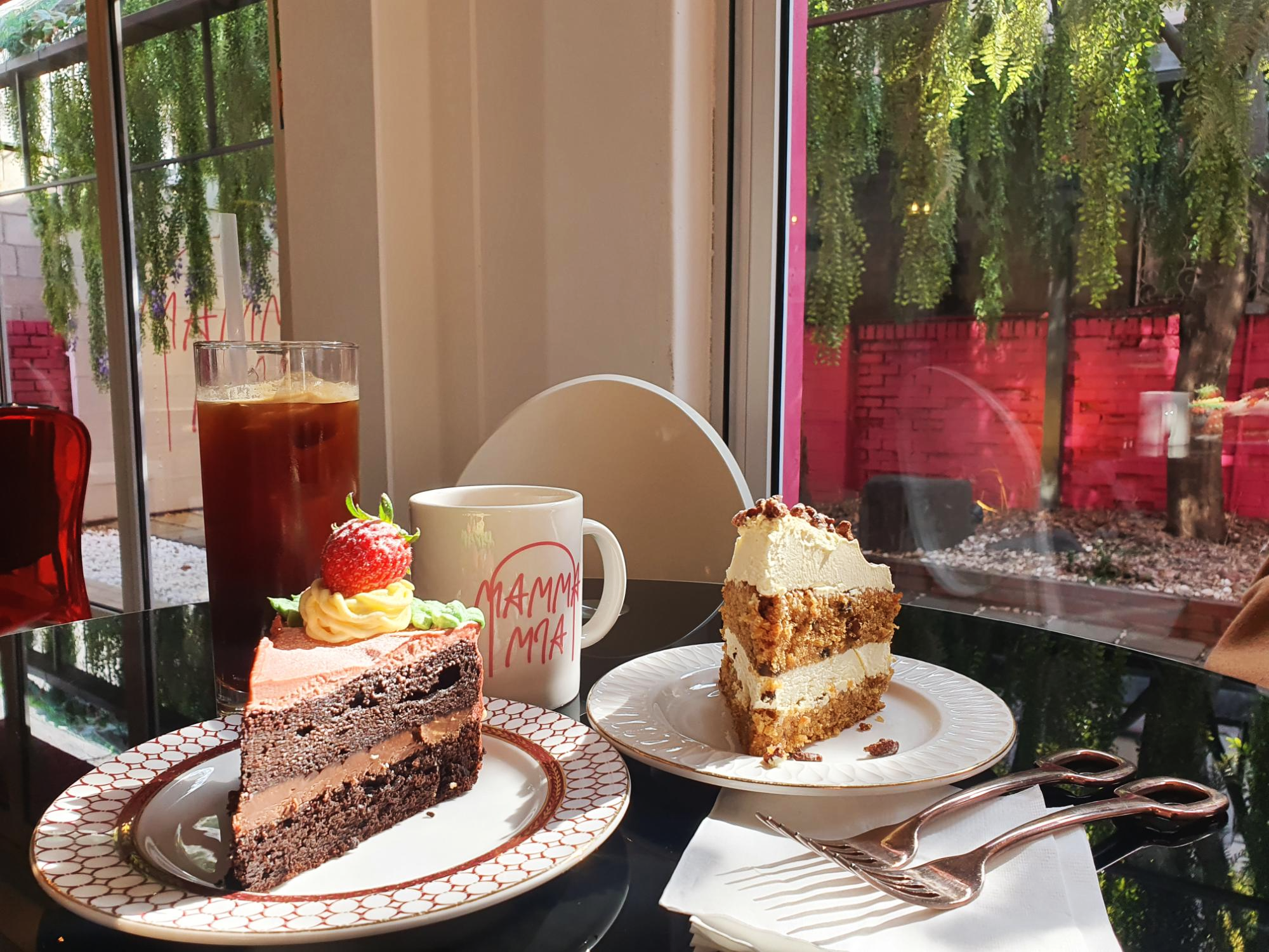 커피맛에 민감한 저희 부부는 맘마미아에서 따뜻한 아메리카노와 차가운 아메리카노를 시켜서 먹었습니다. 호불호가 없을 거 같은 산미가 강하지 않은 커피였고, 남편이 고른 건 초코와 딸기가 들어간 케이크인데 꾸덕 브라우니가 생각났고요. 저는 당근케이크 킬러라 오늘도 역시 당근당근🥕 제가 예전에 연남동에 무슨 핫하다는 케이크집이 있어서 갔더니 이쁘기만 하고 맛은 없어서 실망했던 기억이 있거든요.. 여기서도 케이크가 이쁘니까 맛은 없겠지? 했는데!!! 생각했던 거와 달리 이쁜데 맛까지 있어서 더 만족스러웠던 곳이에용.. 압구정 로데오 걷다가 생각나시면 한번 들려보세요!🧡