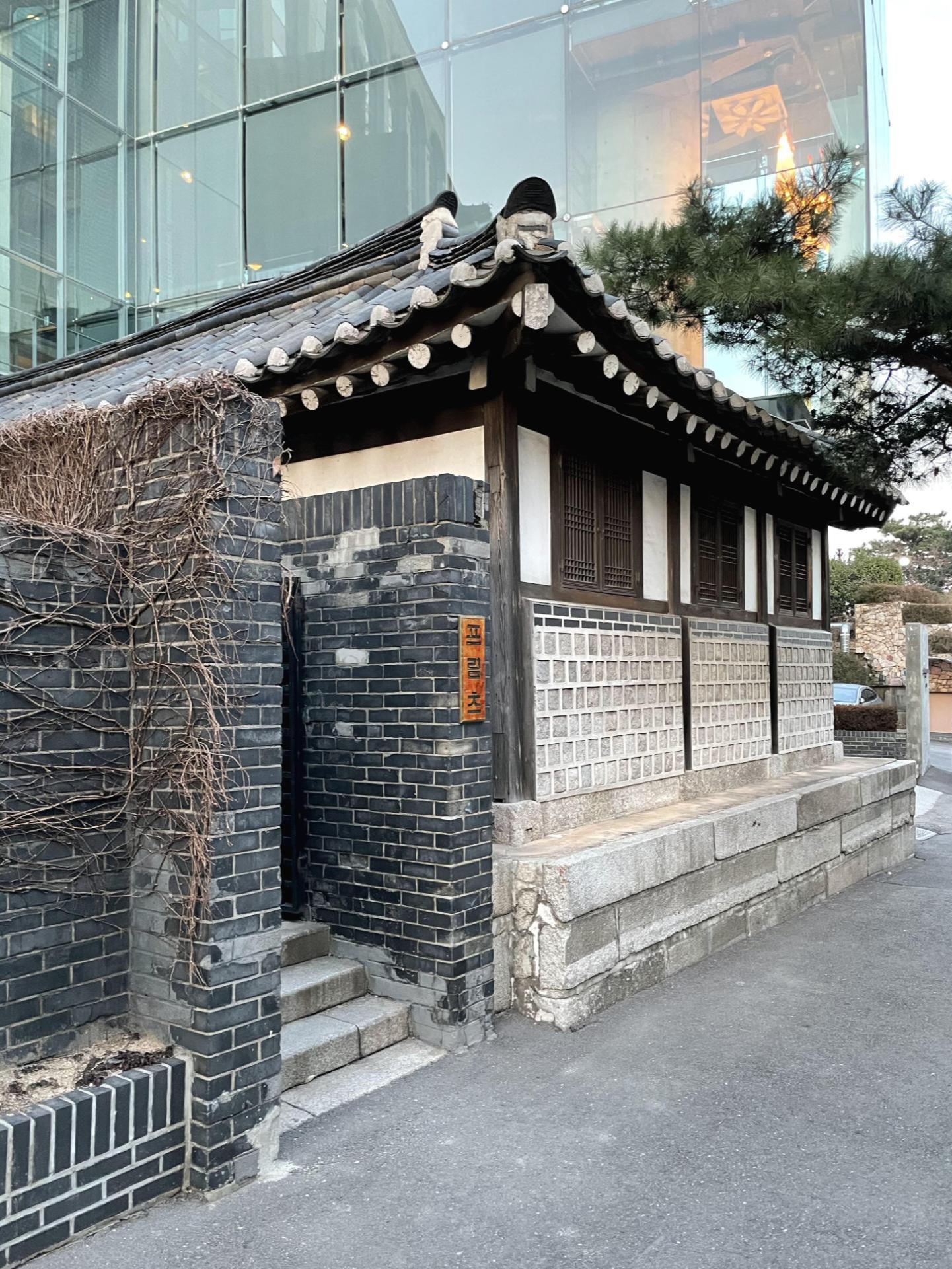 담벼락과 돌이 박혀있는 바닥 그리고 자연과 잘 어우러지는 현대적인 한옥 스타일 카페를 보니 마음이 편안해지네요. 가을이라 담벼락 위로 자란 단풍 든 나무를 보니 더 설레었던 날.